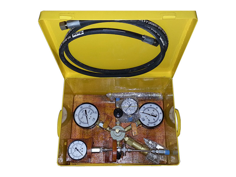 The Inflation Apparatus has been developed to meet the requirements of charging/recharging with nitrogen of empty or partially charged shock struts/brake accumulators of Helicopter, to their rated pressures. This equipment is compact and when packed in case is easily transportable.